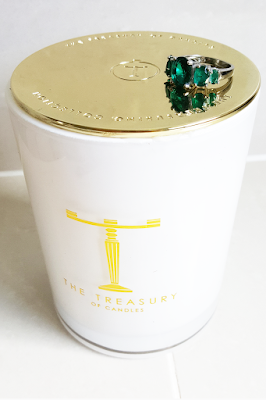 Housed in a tall white recyclable glass with shiny gold lid. It really is a beauty! These Treasury candles